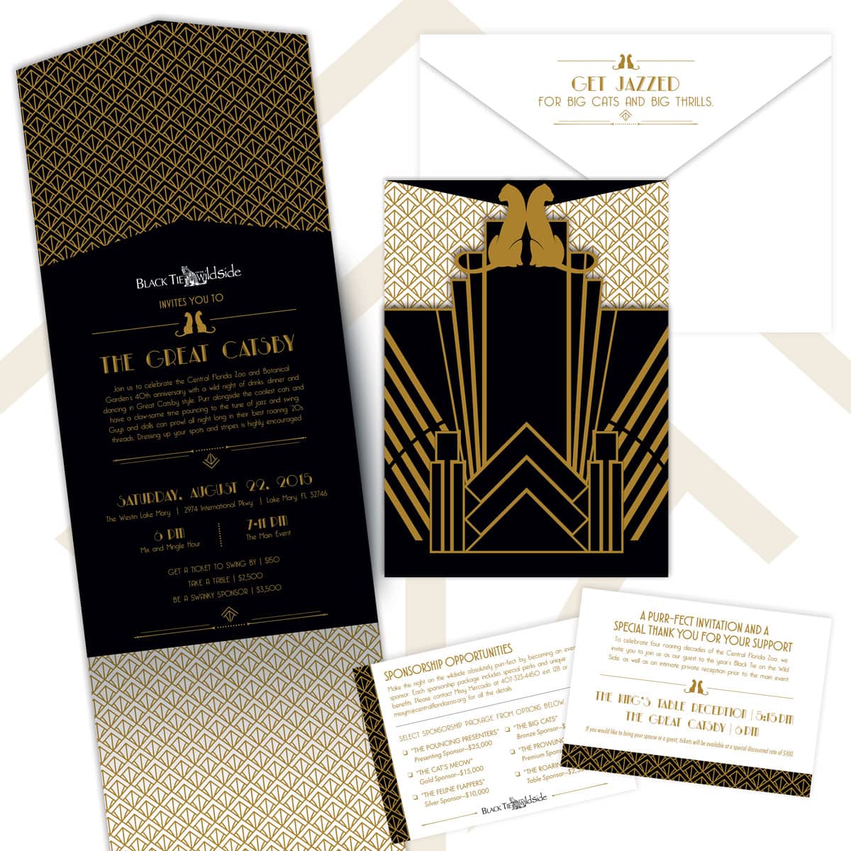 When tasked with developing an invitation for the Central Florida Zoo’s Black Tie on the Wild Side celebrating the attraction’s 40th anniversary, we wanted to create something that promised a roaring good time at the “Great Catsby” themed event. We came up with a 1920s art deco inspired look and feel (complete with bold patterns and plenty of lavish gold accents) sure to get guys and dolls riled up for a wild night. The invitation shines with a custom die-cut featuring the party’s most ferocious stars—the zoo’s big cats—and unfolds to reveal a sophisticated typographical design.