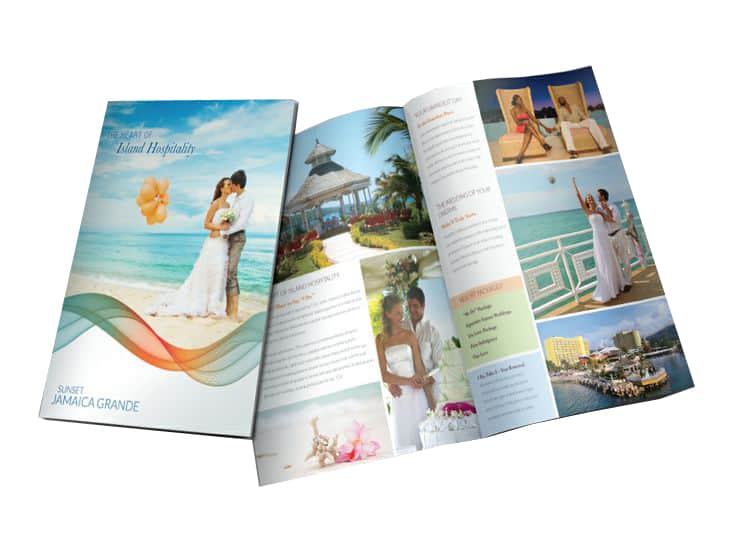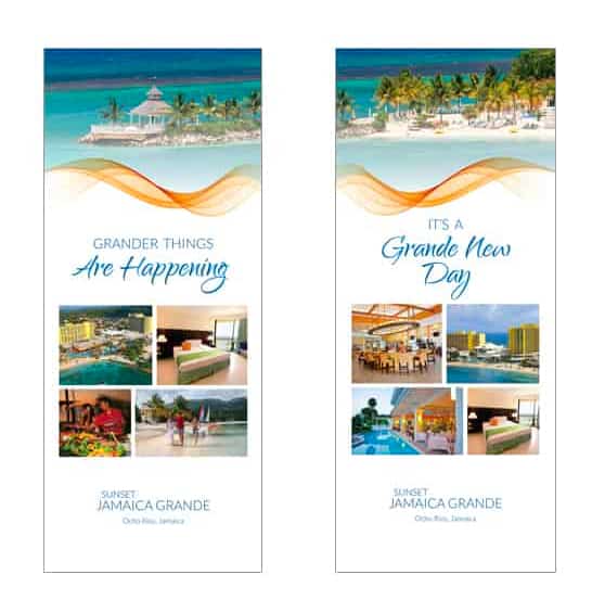 Our engagement with the Jamaica Grande closely followed the property’s separation from the Sunset Resorts chain of properties, which presented the unique challenge of developing both a new brand identity and transitional pieces to be used before the new brand’s official launch. To accomplish this, we looked to the property’s tropical location for inspiration. Our team created a custom “windswept” font to be used across branding, as well as a “wave” accent that hinted at the new look and feel within transitional pieces.