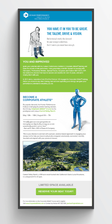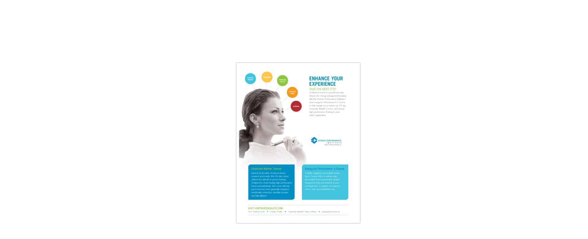 We developed visual and messaging conveying the organization’s offerings for use across print and digital platforms. This included the illustrated “blue man,” which visually represents the results of successful energy engagement in an individual, as well as the energy fulfillment that occurs after the HPI energy management principles.