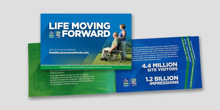 Our team supported National Mobility Awareness Month through the creation, production and distribution of campaign materials targeting both association members (dealers, manufacturers, etc.) and those living or caring for a person with disabilities. Marketing outreach included Dealer Kits stocked with posters, window clings, table tents and a campaign guidebook, as well as a media tour featuring prominent figures within the disability community as spokespeople.