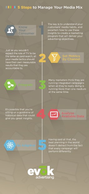 So, rather than focus too much on where advertising budgets are being spent, there are other guidelines that will better serve marketers when allocating their budgets. The following five processes should allow you to more effectively set and manage your media mix, and its role within the marketing communications plan.