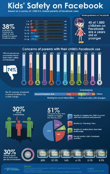 Their findings uncovered 38 percent of kids on Facebook are under the age of 13. Also, the main concerns or disadvantages ranked highest by parents are: sexual predators, releasing too much public information and cyberbullying.