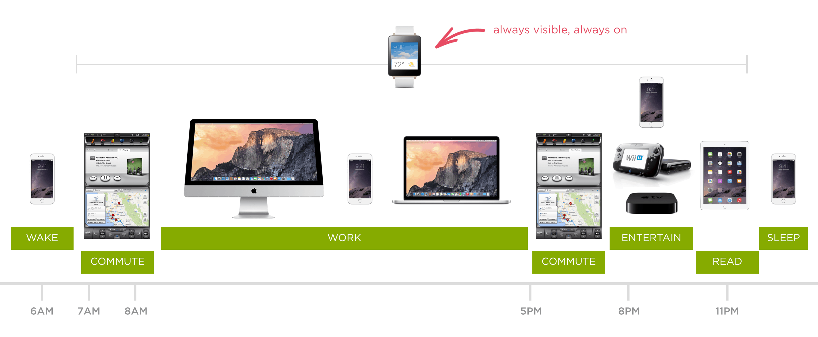 The idea behind smart watches is that everything you could possibly need is just a glance away and it’s literally “hands-free.” Your wallet, phone, GPS, entertainment, finances and more are available at any given moment through your watch – and it still serves the traditional purpose of timekeeping. The graphic below, courtesy of Luke Wroblewski, does a great job of showcasing the multi-functionality of this technology.